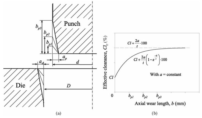 (a)模具磨損示意圖,(b)有限沖切間隙隨著磨損量增加曲線關系
