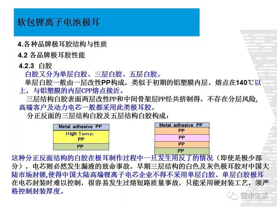 黃膠極耳有分層的危險。但黃膠極耳的封裝條件比白膠容易調(diào)節(jié)。前期日本極耳膠供應(yīng)商也提到黃膠的不足,表現(xiàn)為3點(diǎn):