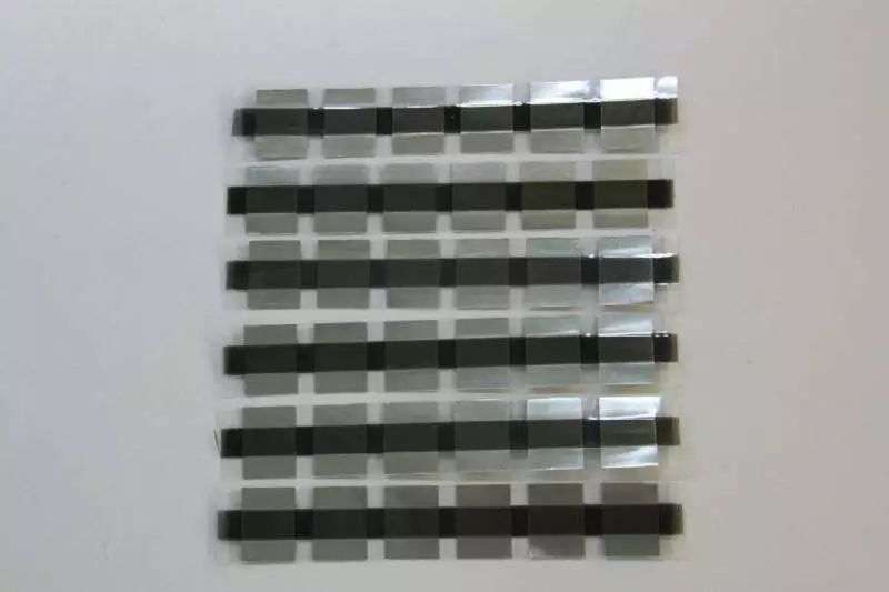 ⑵板式極耳(金屬帶加上膠片后裁切成單個的,然后成排擺放用兩片薄透明塑料片夾在中間),用于普通生產(chǎn)產(chǎn)線。
