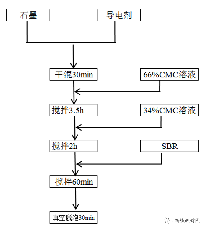 (1)干混:使粉體充分混合,固體之間的混合比在液體下固體間的混合容易多了。同時防止CMC團聚,縮短CMC溶解時間。(2)捏合:高固含量下漿料比較硬,攪拌槳運動時可以對漿料進(jìn)行摩擦剪切,同時由于攪拌槳呈麻花結(jié)構(gòu),運動時會對漿料產(chǎn)生向下的擠壓作用。一方面可以使大顆粒破碎掉,另外使CMC包覆在石墨表面,由于CMC帶正電,包覆在石墨表面后形成雙電層結(jié)構(gòu),石墨間由于靜電排斥,可以防止石墨顆粒間團聚。生產(chǎn)采用60~63%固含量攪拌,出于對設(shè)備損耗的考慮,由于生產(chǎn)采用200L和650L的攪拌罐,高固含量下,電機功率無法承受,因此采用低粘度攪拌。低粘度下不利于CMC的包覆,因此攪拌時間須延長。(3)第二步加CMC:CMC分子鏈基團與水分子存在氫鍵作用,懸浮在溶液中形成龐大的空間位阻,防止?jié){料沉降。(4)攪拌分散時間:使CMC充分溶解。生產(chǎn)采用2h攪拌是利用漿料剪切變稀的原理降低漿料粘度,使?jié){料可以做到較高固含量。