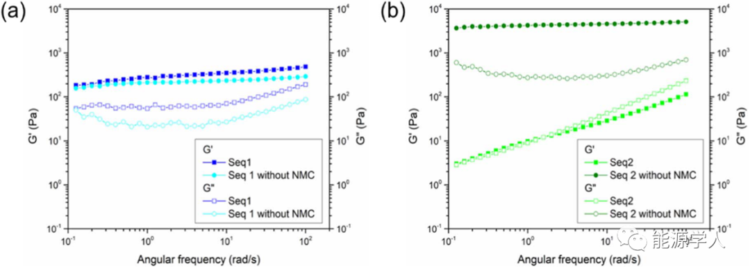 1)在順序1中的第二次混合過程中,CB納米顆粒分首先和PVDF纖維結(jié)合形成穩(wěn)定的凝膠,再與加入的NMC顆粒發(fā)生強(qiáng)相互作用,凝膠結(jié)構(gòu)得以保留。