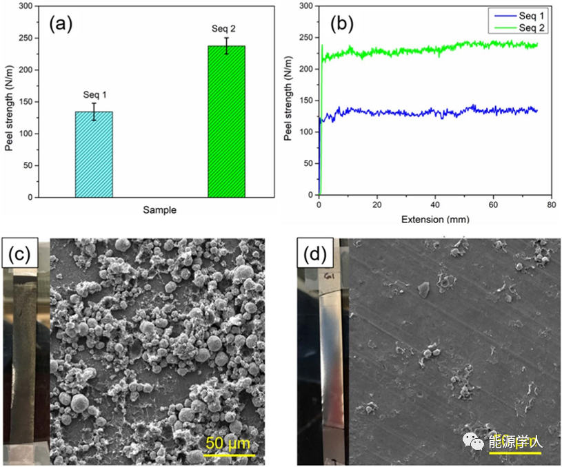 圖5.兩種順序制備電極的粘結(jié)強(qiáng)度測(cè)量(a)剝離強(qiáng)度圖(b)剝離強(qiáng)度-延伸率曲線(c)和(d)分別是剝離測(cè)試后對(duì)應(yīng)于的電極表面