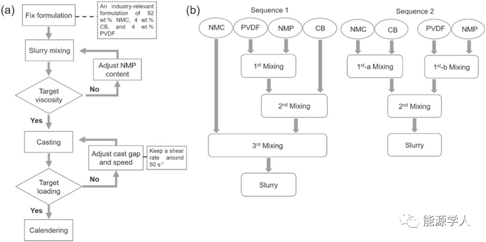 順序1:第一步將PVDF溶解在NMP溶劑中,第二步將CB添加到PVDF溶液中,第三步將NMC粉末混合到混合物中。