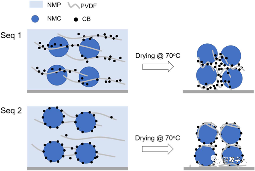 因此,順序1制成的漿料的“強(qiáng)度”由PVDF鏈的纏結(jié)和CB的填充效應(yīng)共同提供。順序2制成的漿料的“強(qiáng)度”主要由PVDF鏈的纏結(jié)提供。導(dǎo)致順序2制成的漿料流動(dòng)性較好。在干燥過程中,使用順序1制得的漿料隨著NMP的蒸發(fā),CB納米顆粒被捕集在PVDF聚合物基質(zhì)中,形成了填充NMC顆粒之間空間的多孔CB/PVDF簇。在干燥使用順序2制得的漿料時(shí),附著在NMC顆粒上的CB納米顆粒會(huì)吸收PVDF,從而在NMC顆粒上形成致密的CB/PVDF層。