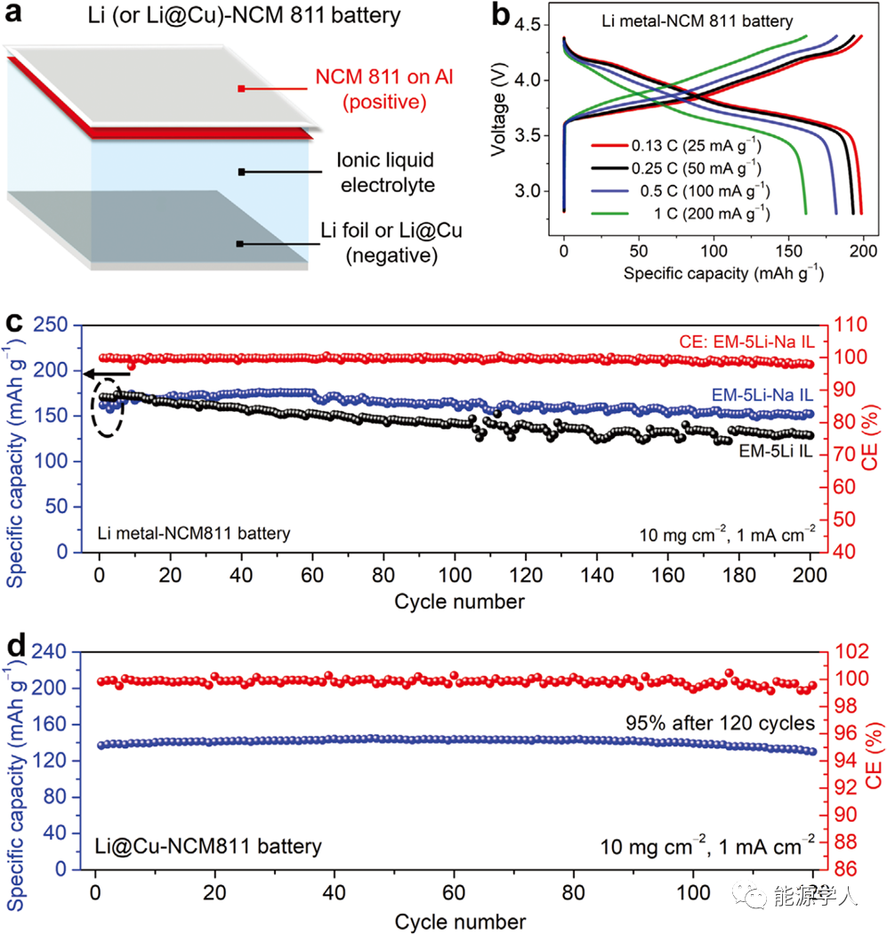 圖5 采用EM-5Li-Na-IL電解液的NCM811基鋰金屬電池。a) NCM811基鋰金屬電池結(jié)構(gòu)示意圖,負(fù)極為L(zhǎng)i金屬或Li@Cu。b) NCM811基鋰金屬電池不同倍率下(0.25-1 C,25-200 mA g-1)的恒流充放電曲線。c) 分別使用EM-5Li和EM-5Li-NaIL電解液的Li-NCM811電池在0.5 C下的循環(huán)穩(wěn)定性。(b-c)中的比容量均基于NCM811的質(zhì)量。d) 使用EM-5Li-Na IL電解液的Li@Cu-NCM811電池在0.5 C下的的循環(huán)穩(wěn)定性。所沉積Li金屬的容量約1.8倍過量。(d)中比容量基于正、負(fù)極總質(zhì)量。(a-d)中NCM811的載量為≈10 mgcm?2。