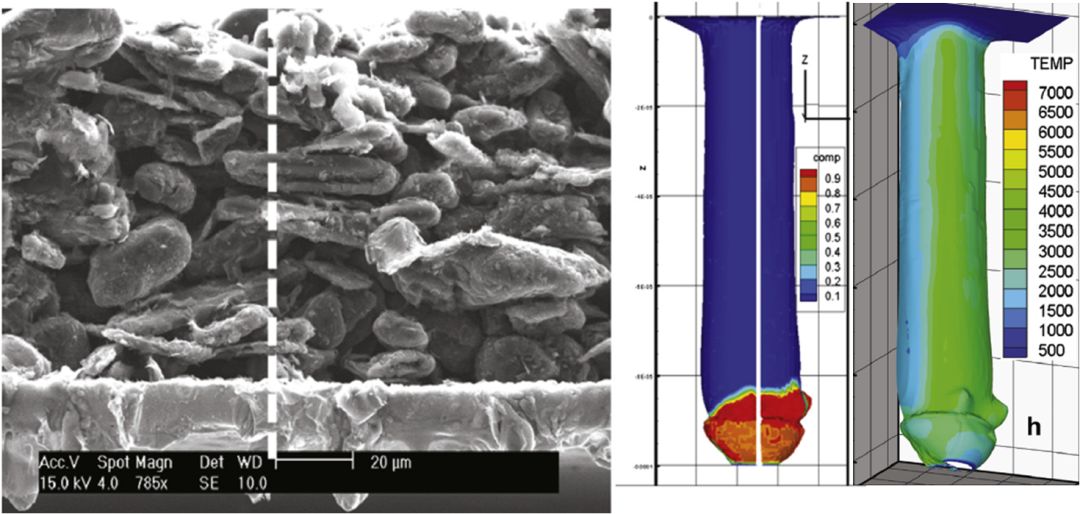 由于鋰離子電池極片是雙面涂層+中間集流體金屬層的結(jié)構,而且涂層與金屬箔材之間性質(zhì)差異大,對激光作用的響應也不相同。激光作用在負極石墨層或正極活物質(zhì)層時,由于它們具有很高的激光吸收率,導熱系數(shù)也很低,因此,涂層需要相對較低的熔化和汽化激光能量,而金屬集流體對激光具有反射作用,并且熱傳導快,因此金屬層的熔化和汽化激光能量升高。圖7是單面涂層的負極在激光作用下極片厚度方向的銅成分和溫度分布,當激光作用在石墨層時,由于材料的特性,石墨主要發(fā)生汽化,當激光侵入到金屬銅箔時,銅箔開始發(fā)生熔化,形成熔池。工藝參數(shù)不合適時,可能出現(xiàn)問題:(1)切邊涂層脫落,露出金屬箔材,如圖8左圖所示;(2)切邊周圍出現(xiàn)大量切屑異物。這些都會導致電池出現(xiàn)性能下降、安全性品質(zhì)問題,如圖8右圖所示。因此,當采用激光切割時,需要根據(jù)活物質(zhì)材料和金屬箔材的特性,優(yōu)化合適的工藝參數(shù),才能既完全切割極片,又形成良好的切邊質(zhì)量,不產(chǎn)生金屬切屑雜質(zhì)殘留。