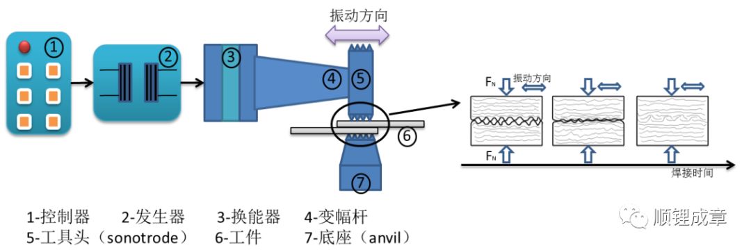 在超聲焊接過(guò)程中,換能器把高頻電信號(hào)轉(zhuǎn)化為超聲振動(dòng)信號(hào),高頻振動(dòng)通過(guò)焊接工具頭傳遞到待焊金屬表面,界面金屬氧化膜在一定的壓力和超聲振動(dòng)的劇烈摩擦作用下破碎,界面潔凈金屬接觸并在摩擦和超聲軟化的共同作用下,進(jìn)一步產(chǎn)生塑性流動(dòng)和擴(kuò)散使連接面積逐漸增大最終形成可靠的連接。