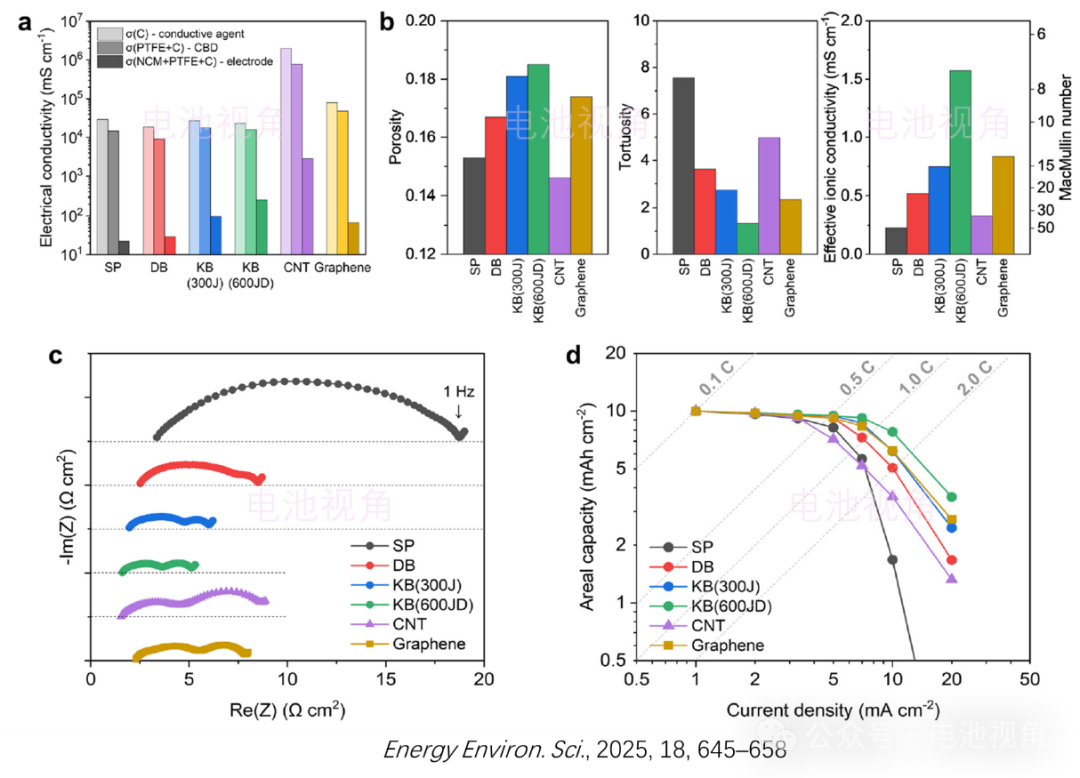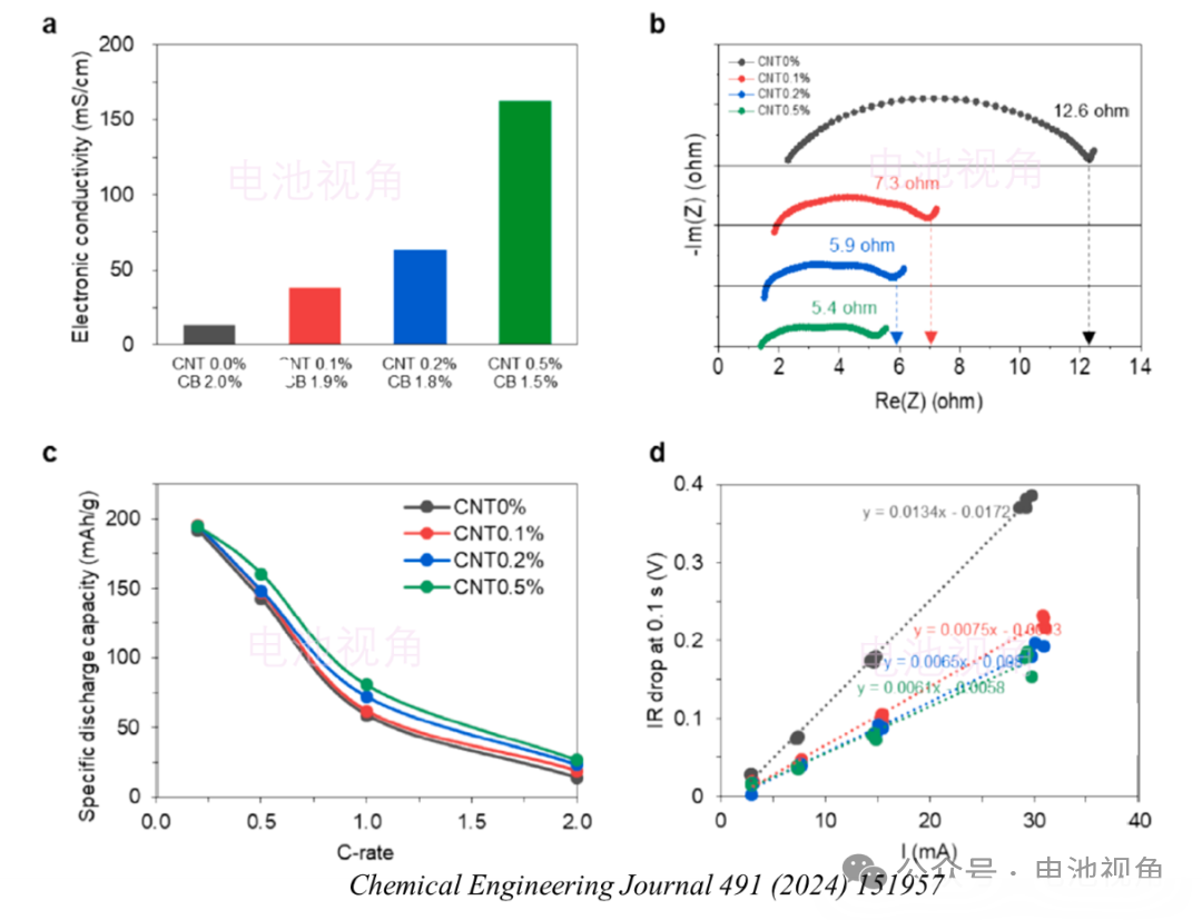 對于無需PTFE,而可以單獨(dú)形成3D網(wǎng)絡(luò)的CNT(),其用量顯著影響電池的性能,如圖1所示.這很容易理解,導(dǎo)電劑作為電子導(dǎo)電通路,0D導(dǎo)電劑CB跟周圍形成點(diǎn)接觸而1D導(dǎo)電劑CNT能跟周圍形成線接觸,能夠提高電極的導(dǎo)電性(如圖1a-b所示),從而提高電池的倍率性能(圖1c),降低其過電勢(圖1d).需要注意的是,這里雖然倍率性能跟極片導(dǎo)電能力呈現(xiàn)正相關(guān),但從很多實(shí)驗結(jié)果看,有些情況下降低阻抗并不都能提高倍率性能.